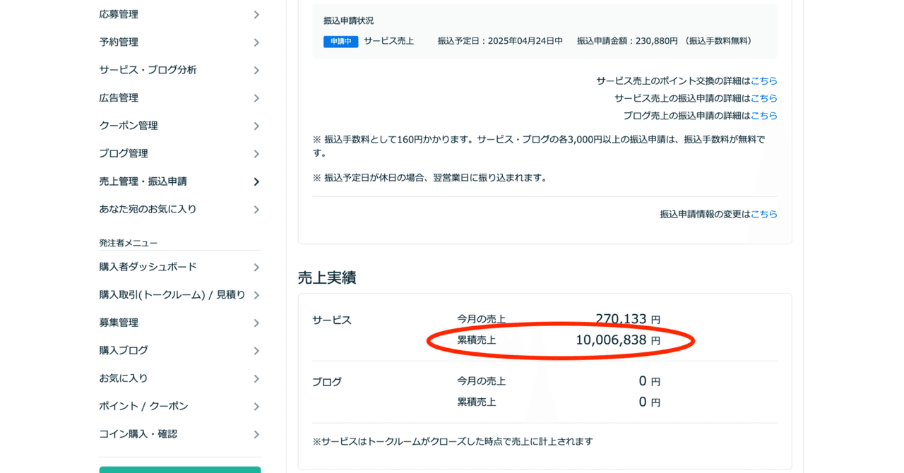 月ごとの収益を公開しているnoteで、ココナラ出品者として感じたことがリアルに綴られています。